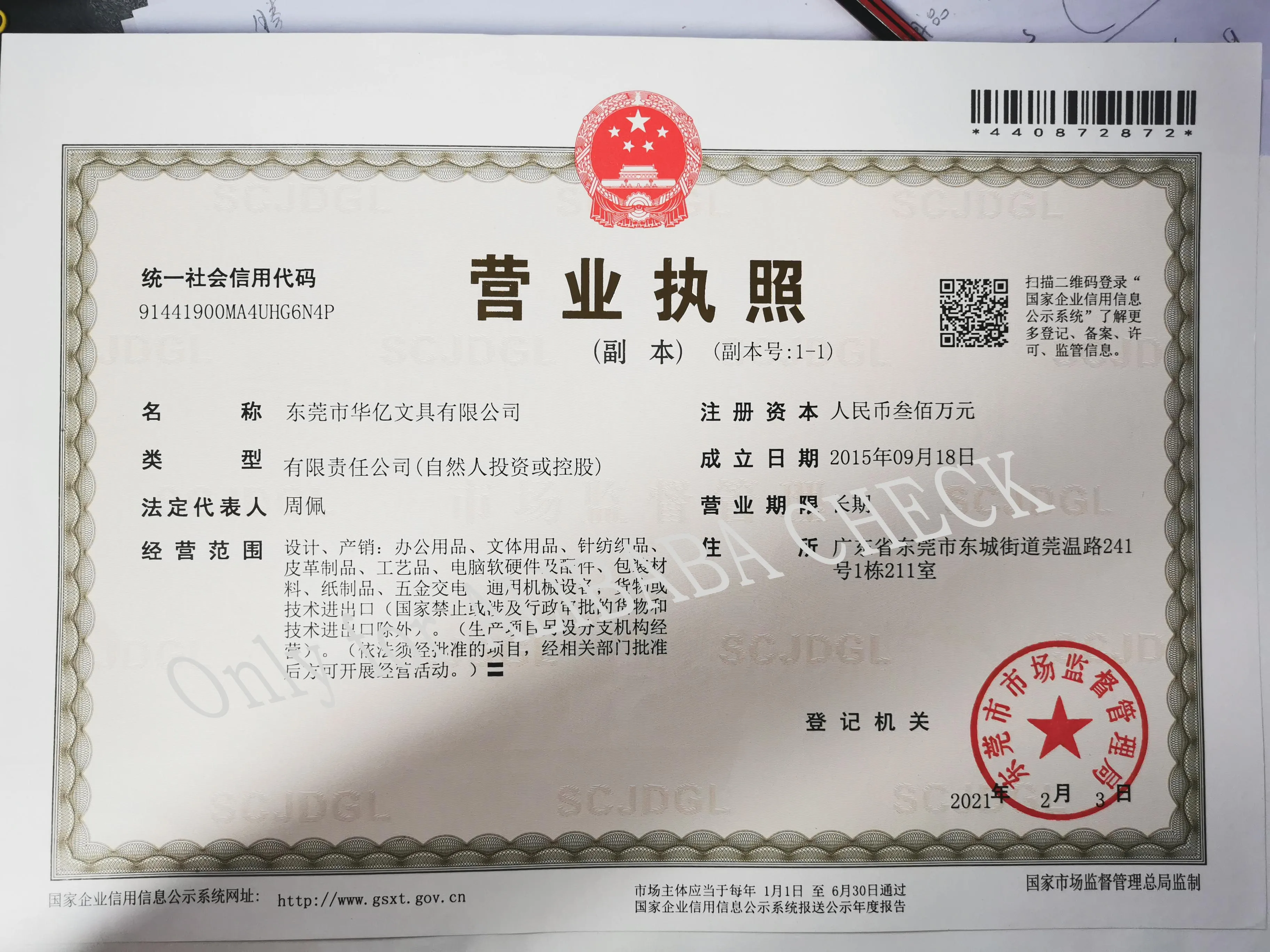 Registered address : Room 211, Building 1, No. 241 Guanwen Road, Dongcheng Subdistrict Dongguan Guangdong China